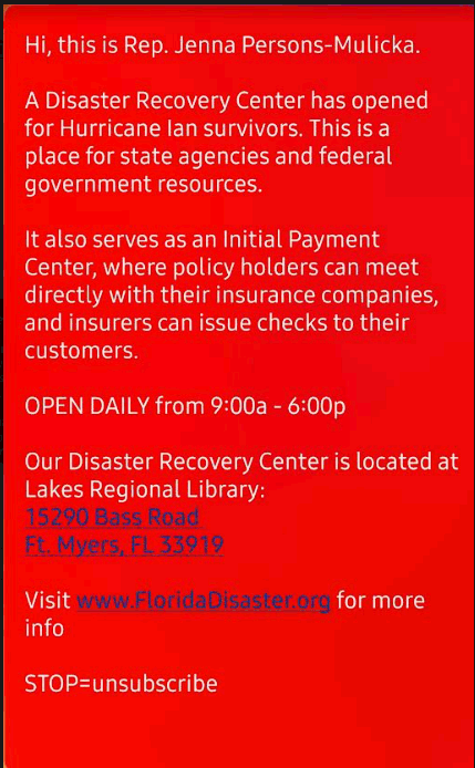 from Rep. Jenna Persons-Mulicka regarding Hurricane Ian Assistance: