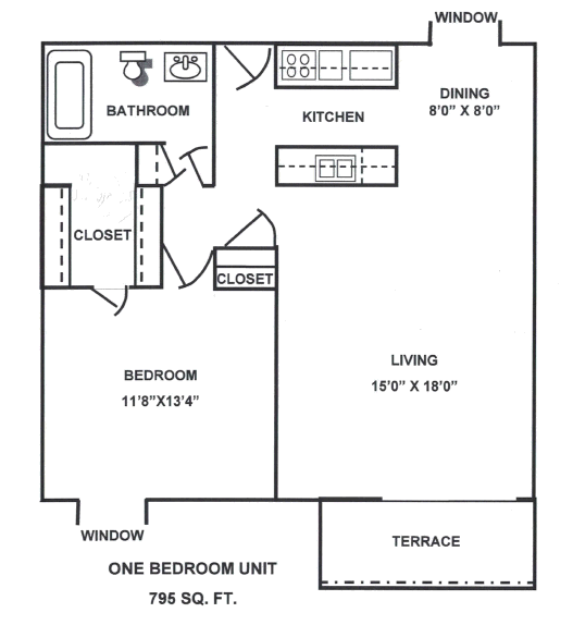 One Bedroom: 795 square feet