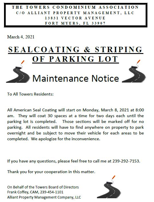 All American Seal Coating will start on Monday, March 8, 2021 at 8:00 am. They will coat 30 spaces at a time for two days each until the parking lot is completed. Those sections will be marked off for no parking. All residents will have to find anywhere on property to park overnight and be subject to move their vehicle for each areas to be completed. We apologize for the inconvenience.