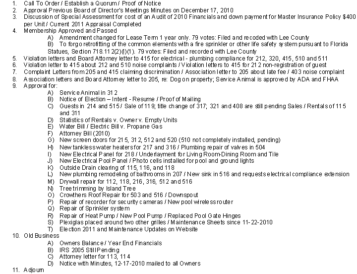 AGENDA  This agenda was prepared by Alliant Property Management, LLC, located at 6719 Winkler Road, Suite 200, Ft. Myers, Florida 33919 in accordance with Florida Statutes.  |